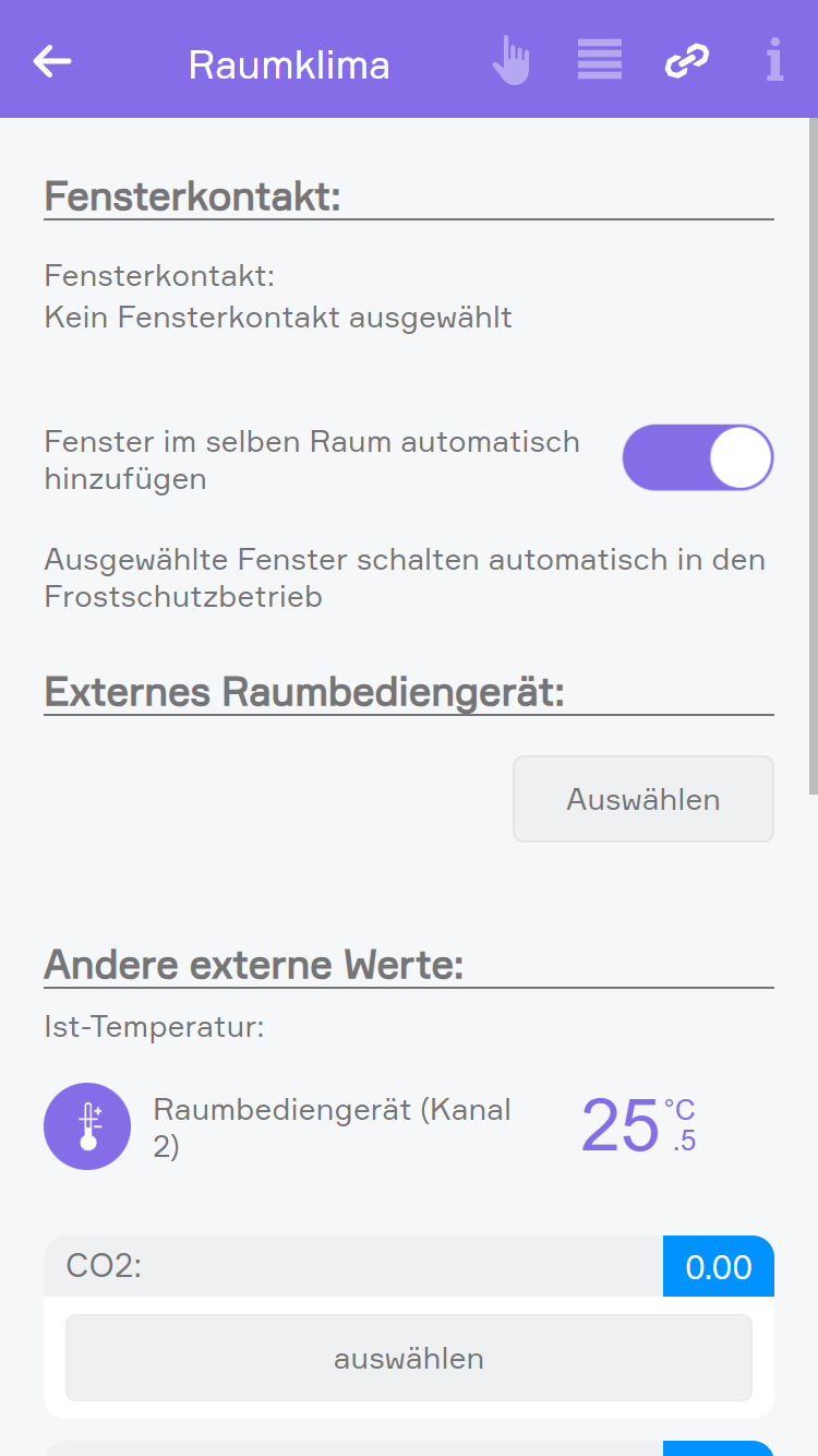Um sicherzustellen, dass das Heizen unterbrochen wird, wenn ein Fenster geöffnet wird, können Sie hier über den Button “hinzufügen” beliebig viele Fenster hinzufügen. Wird nun ein hinzugefügtes Fenster geöffnet, so wird diese Raumklimazone automatisch in den Frostschutzbetrieb versetzt. Sobald das Fenster wieder geschlossen ist, wird wieder der Komfortbetrieb aktiviert.