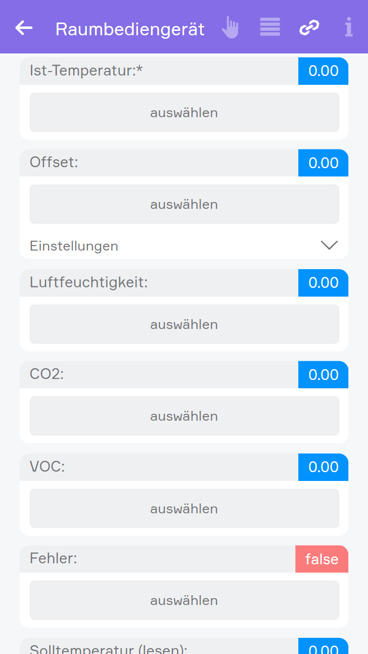 - Solltemperatur (lesen) (Wenn hierfür ein Wert verknüpft wird und für Solltemperatur (schreiben) nicht, dann kann das Raumbediengerät nicht bedient werden)