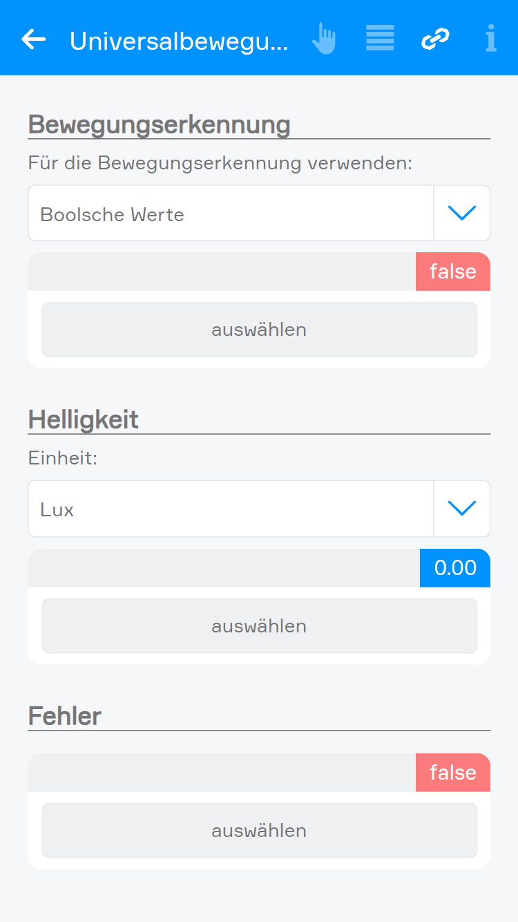 Der Modus des Bewegungsmelders kann im Parameterpanel geändert werden, um ihn als Taster oder digitalen Eingang zu nutzen. Nicht bei allen Modulen sind jedoch alle Modi verfügbar. Ein Bewegungsmelder eines Lichtmoduls kann nur in einen Taster geändert werden. Bei Bewegungsmeldern eines Digitalmoduls stehen alle drei Modi zur Auswahl.