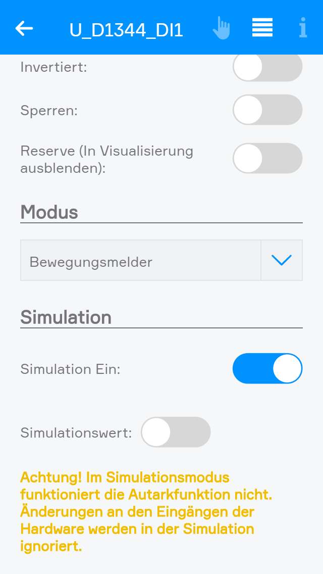 Soll ein Bewegungsmelder im System vorübergehend nicht verwendet werden, kann dieser durch Aktivierung der Option „Reserve (In Visualisierung ausblenden)“ im Parameterpanel in der App ausgeblendet werden. Um dies rückgängig zu machen, kann der Bewegungsmelder in der App Hardware oder Thermokon wiedergefunden werden.