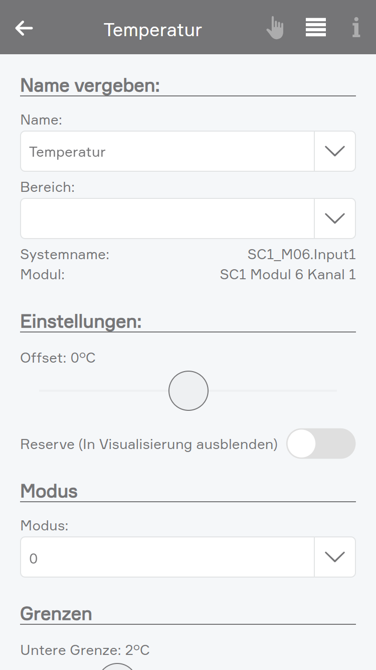 In der App „Temperatur“ sehen Sie alle Modulkanäle an denen Sie Temperatursensoren (wie z.B. PT1000) anschließen können.