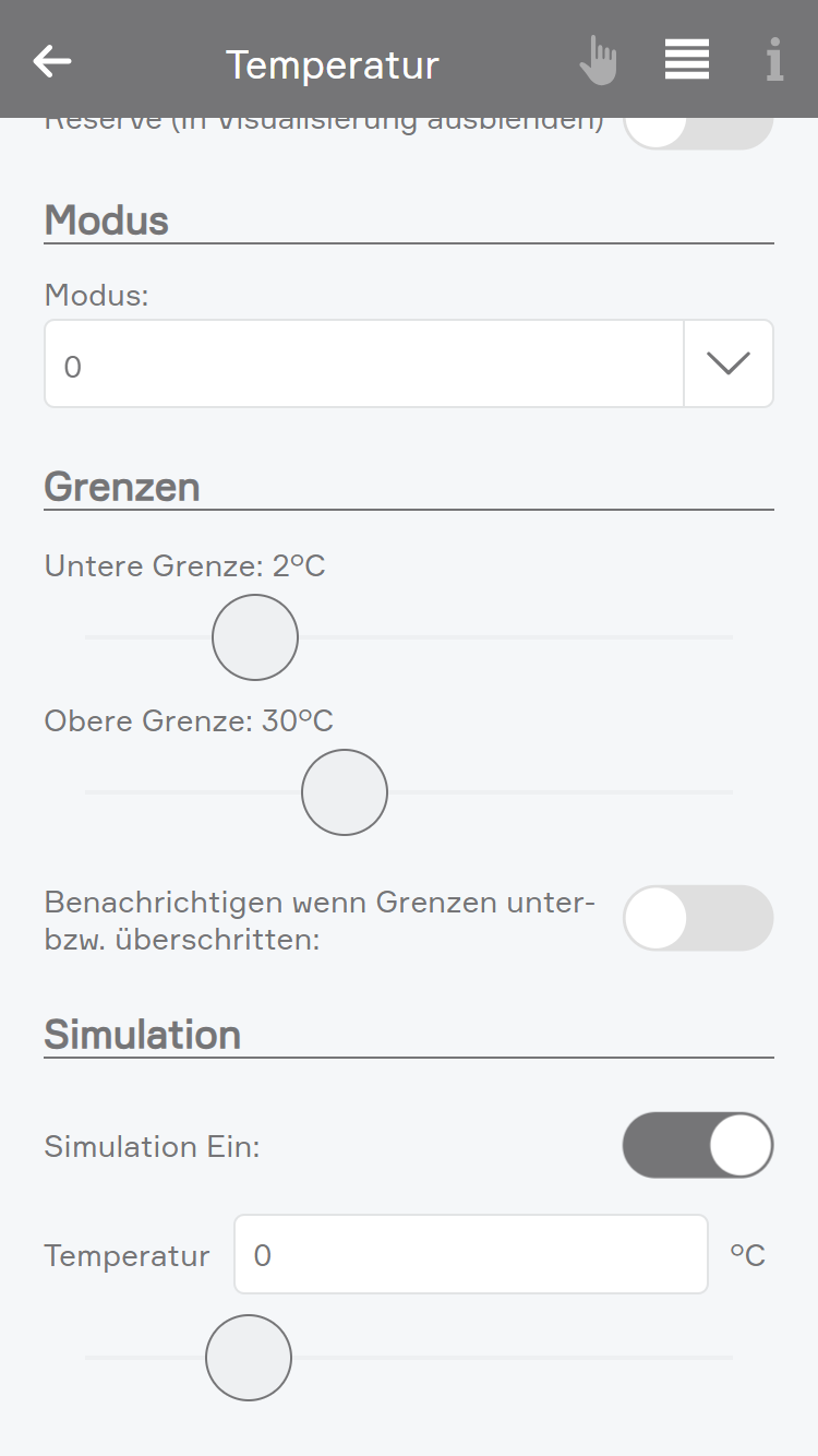 Wenn nachvollzogen werden soll, was passiert, wenn die Temperatur einen bestimmten Wert unter- oder überschreitet, muss der Temperatursensor nicht extra abgekühlt bzw. erwärmt werden. Dies kann über das Operator Panel im Punkt Simulation erfolgen, indem die Checkbox Simulation Ein aktiviert und im darunter erscheinenden Feld die gewünschte Temperatur eingetragen wird.