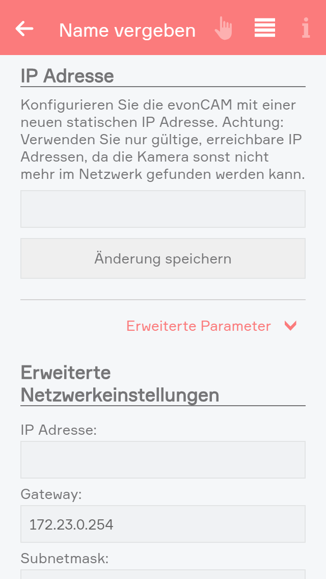 Ändern Sie die IP Adresse, werden andere für die Kamera relevante Netzwerkeinstellungen (Gateway und Subnetmaske) aus der aktuellen Konfiguration der evon Smart Home CPU Netzwerkeinstellung übernommen. Wenn Sie mehr Kontrolle über diese Einstellung haben wollen, steht Ihnen auch ein erweitertes Formular unter dem Button "Erweiterte Parameter" zur Verfügung.