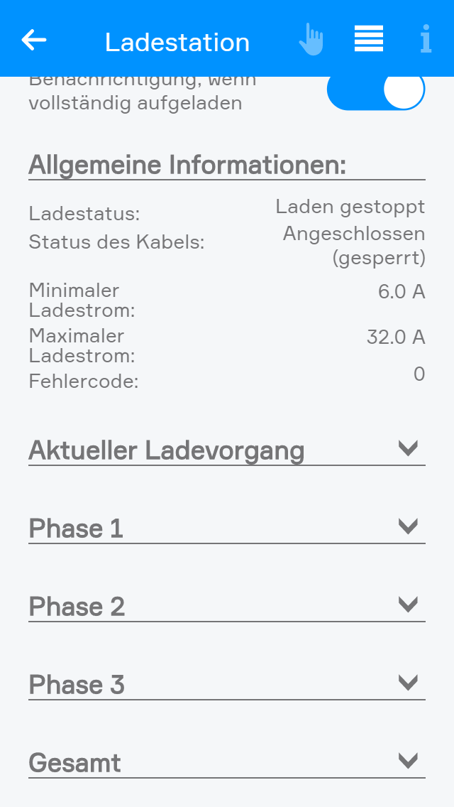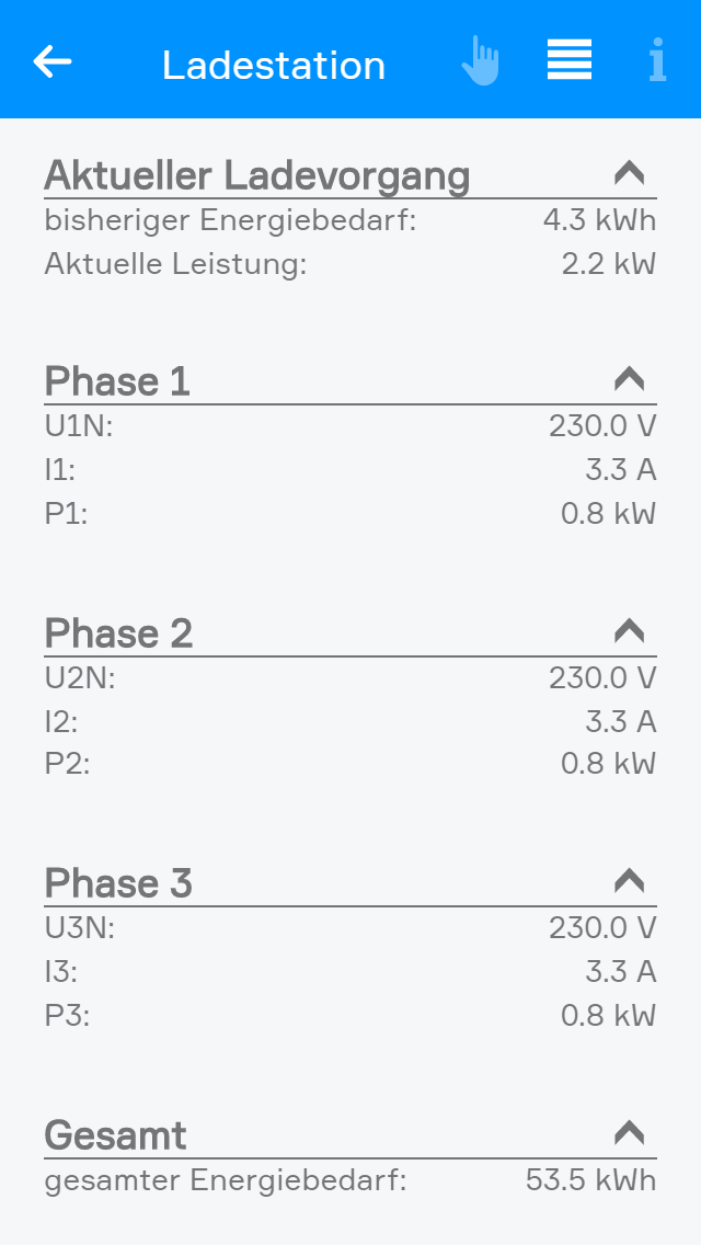 Am Ende des Panels können Sie noch genauere Daten bezüglich des aktuellen Ladevorgangs für die einzelnen Phasen (nur wenn die Ladestation 3-phasig angeschlossen ist) und des gesamten Energiebedarfs seit der ersten Inbetriebnahme einsehen.