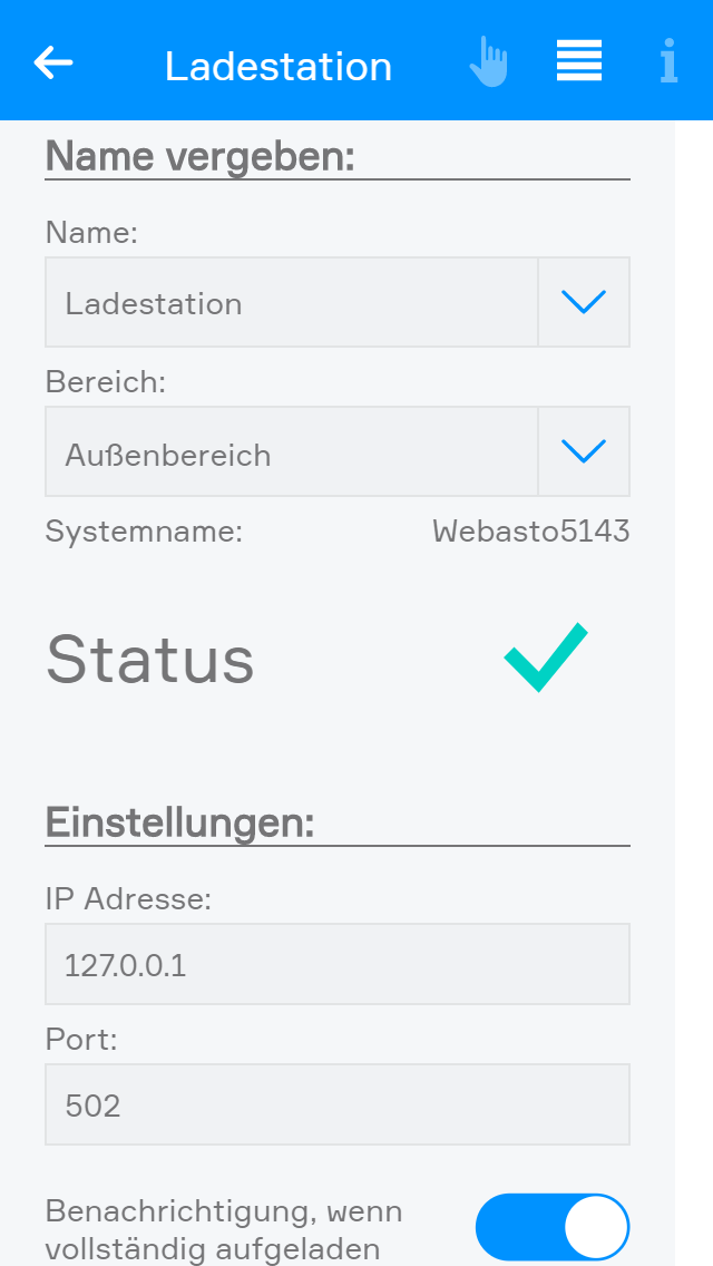 Im Parameter Panel ist neben der Bezeichnung und dem Bereich auch der Verbindungsstatus zur Ladestation ersichtlich. Solange ein rotes "X" angezeigt wird, ist die Ladestation nicht verbunden, ein grünes Häkchen verweist auf eine hergestellte Verbindung.