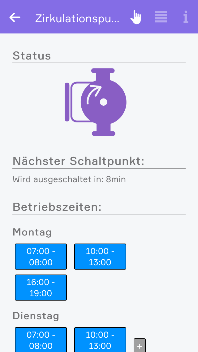 Um eine neue Zirkulationspumpe hinzuzufügen klicken Sie auf das Element “Zirkulationspumpe hinzufügen”. Im Parameterpanel sollten Sie anschließend als erstes einen Namen für Ihre Zirkulationspumpe vergeben. Danach können Sie die Konfiguration vornehmen (wird weiter unten beschrieben).