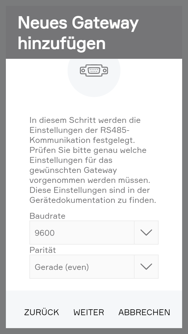 Im nächsten Schritt werden die Baudrate und die Parität abgefragt. Diese können am Gateway über DIP-Schalter eingestellt werden. Weitere Informationen dazu finden Sie im beiliegenden Datenblatt des Gateways.
