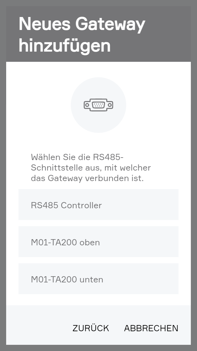 Im ersten Schritt muss die Schnittstelle ausgewählt werden, an welcher das Gateway angeschlossen ist.