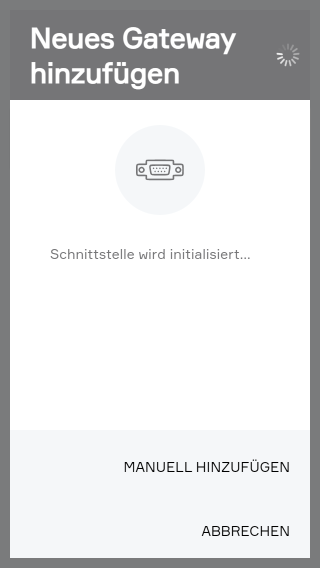 Nachdem auf "Weiter" geklickt wurde, wird nach angeschlossenen Gateways gesucht. Gefundene Gateways können durch einen Klick auf "Hinzufügen", hinzugefügt werden.