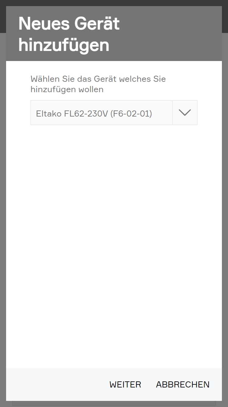 Wenn ein Funk-Lichtaktor eingelernt werden soll, muss im Wizard als Gerät "Eltako FL62-230V (F6-02-01)" ausgewählt und dann auf "Weiter" geklickt werden.