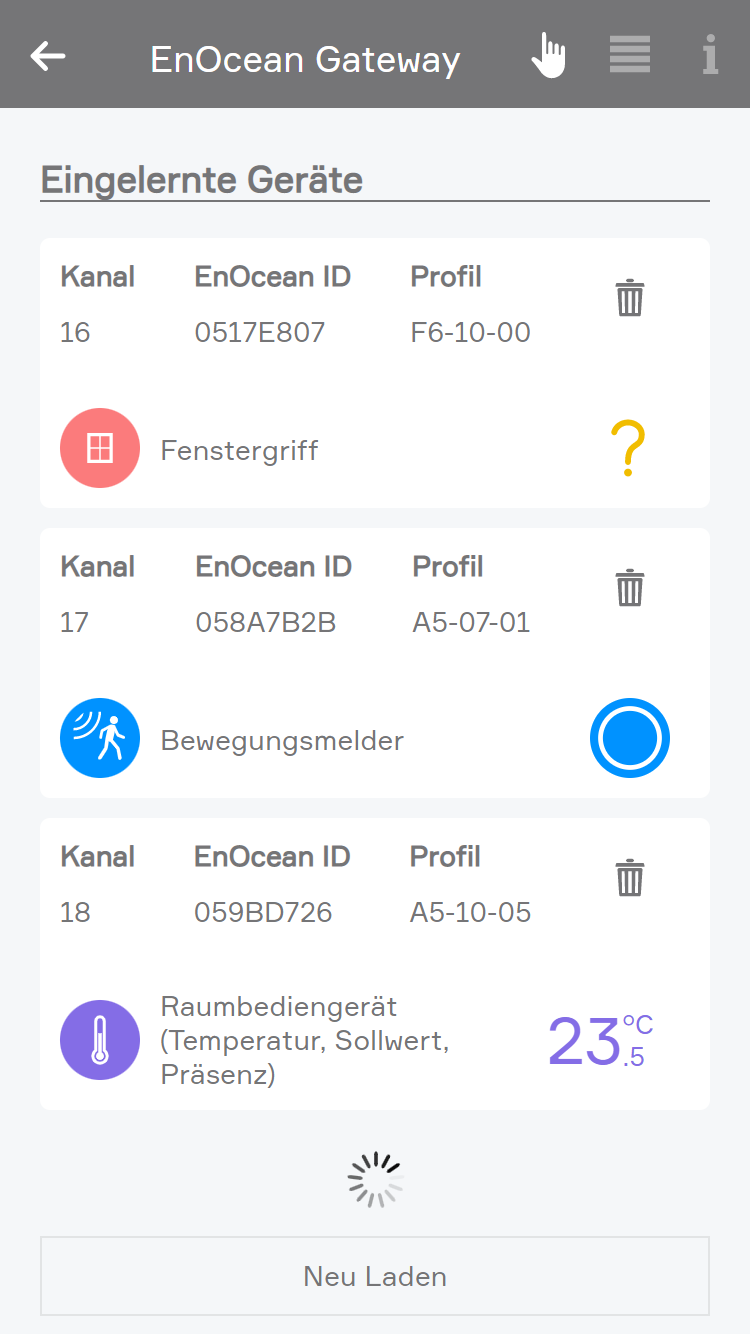 Mit dem Button “Neu Laden” wird die Liste an eingelernten Geräten neu geladen.