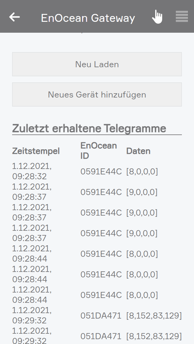 Unter “Zuletzt erhaltene Telegramme” werden die letzten empfangenen EnOcean Telegramme angezeigt.