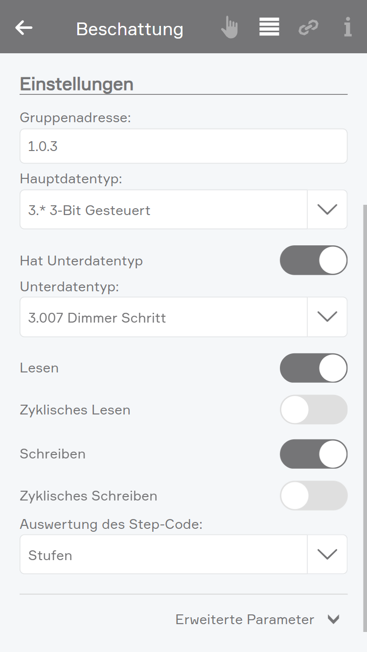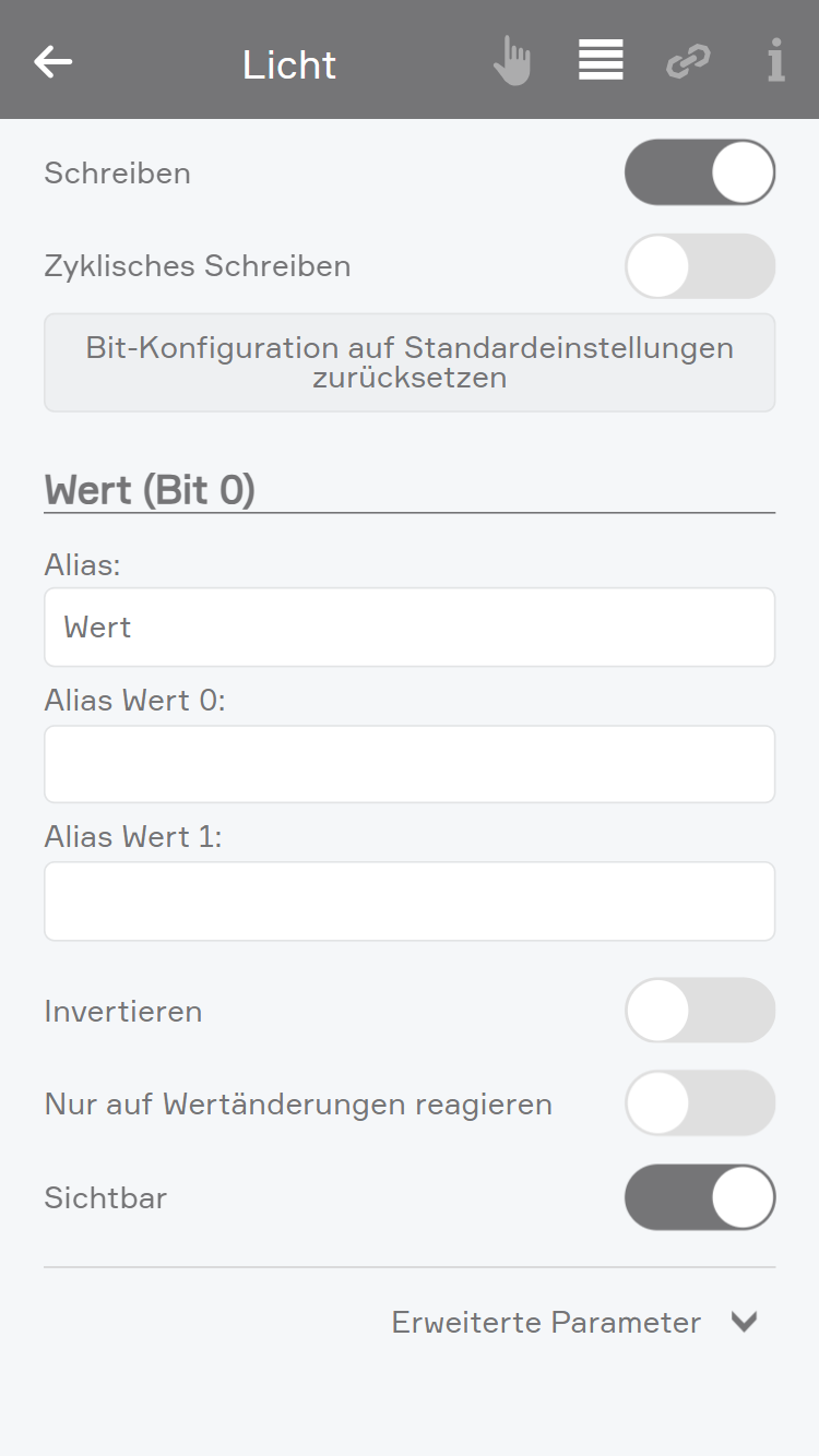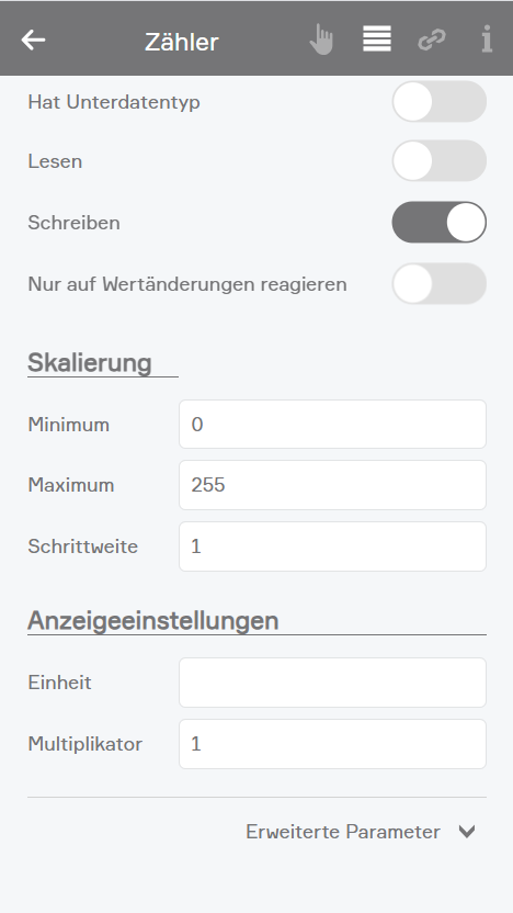 Wenn man im Parameter Panel auf Erweiterte Parameter klickt, werden die zuletzt erhaltenen oder empfangenen Telegramme des Datenpunkts angezeigt