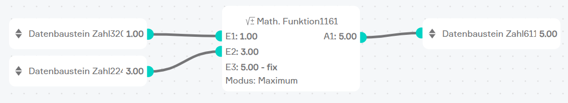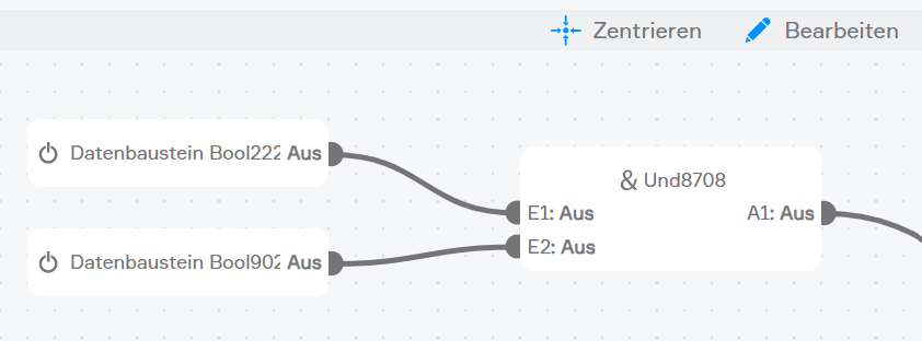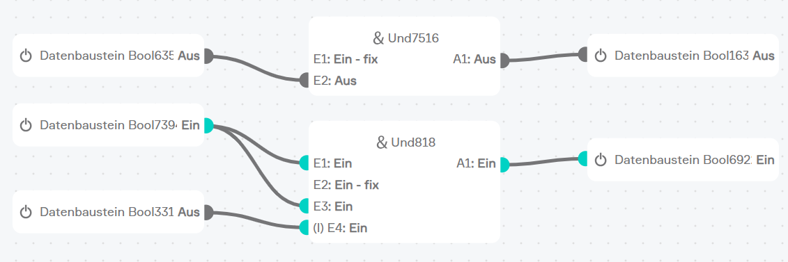 Um z.B. einen Ausgang eines Datenbausteins mit dem Eingang eines Und-Elements zu verknüpfen, muss der Punkt rechts vom Datenbaustein angeklickt, gehalten und zum gewünschten Eingang links vom Und-Element gezogen werden.