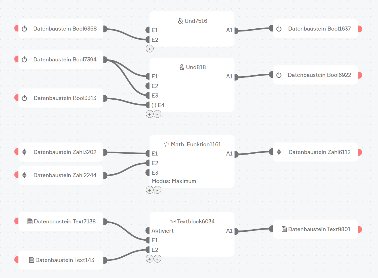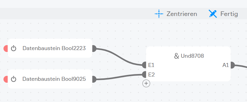 Danach erscheinen links und rechts von den Elementen und Datenbausteinen, farbige oder graue Punkte, je nachdem ob der Ein- oder Ausgang verknüpft ist oder nicht.