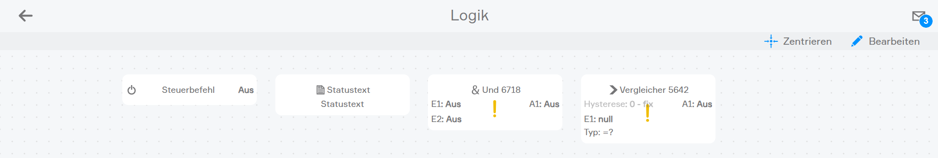 Falls im Logik-Editor bei einem Block in der Mitte ein gelbes Rufzeichen angezeigt wird, sind noch nicht alle notwendigen Ein- oder Ausgänge verknüpft oder Fixwerte für diese vergeben worden.