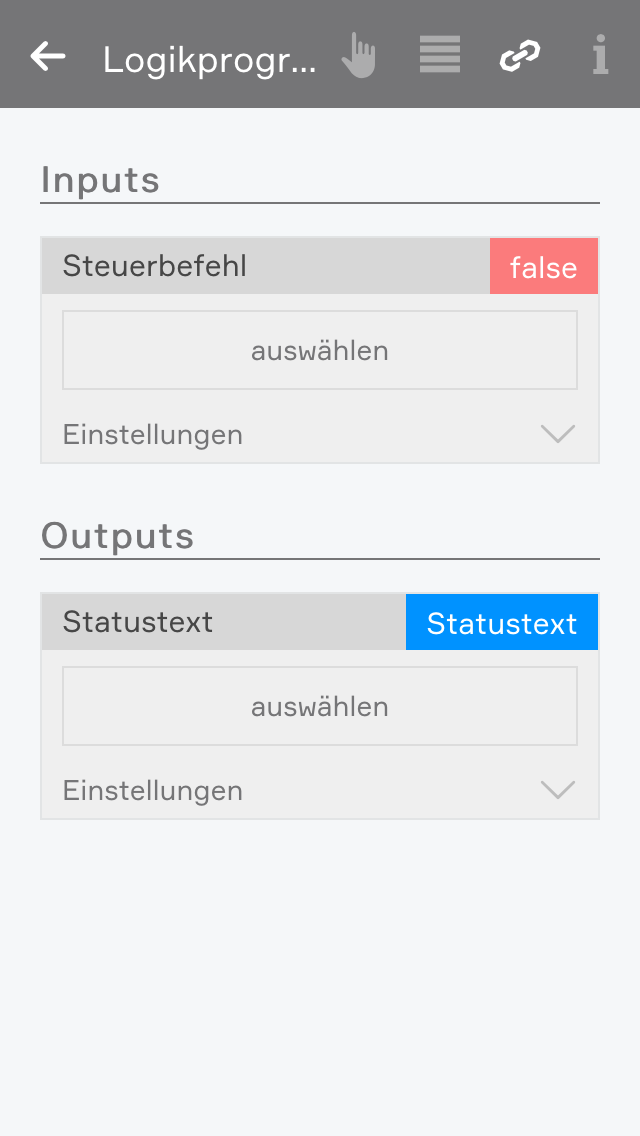 Um eine Logik zu erstellen, wird als Erstes ein Logikprogramm benötigt. Dieses ist vergleichbar mit einem Netzwerk in der SPS-Programmierung. In einem Programm befinden sich dann die Logikbausteine, welche für die Steuerung verwendet werden. Falls z.B. eine Steuerung für eine WC-Lüftung und eine für einen Licht-Trafo erstellt werden soll, sollte für jede dieser Steuerungen, ein eigenes Logikprogramm angelegt werden.