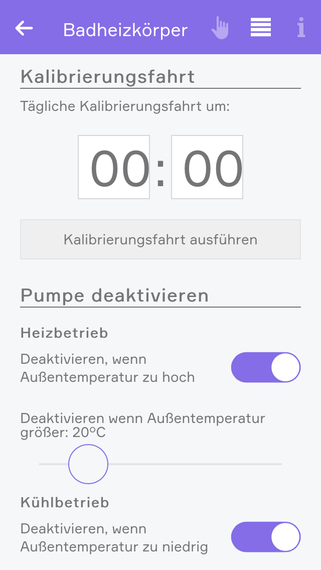 Um Werte für eine Außentemperatur größer als +20°C bearbeiten zu können muss der Kühlbetrieb unter “Alle Apps” – “Einstellungen” – “Raumklima” aktiviert werden. Achtung! Der Kühlbetrieb darf nur aktiviert werden, wenn die Heizung wirklich Kühlen kann, da im Kühlmodus die Mischerausgänge genau umgekehrt geschalten werden.