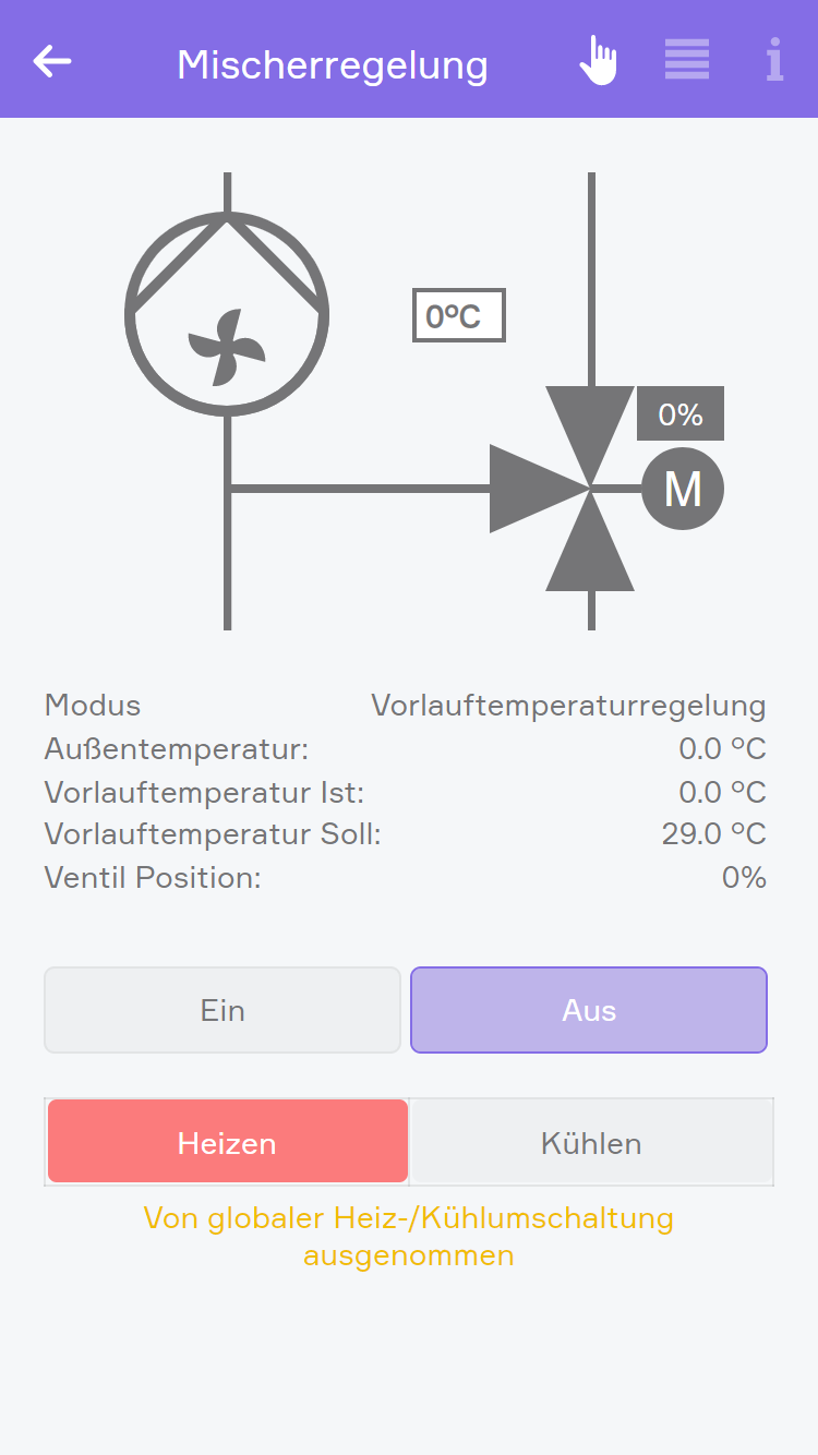 In diesem Zustand bleibt die Mischerregelung im eingestellten Heiz- oder Kühlbetrieb, auch wenn der globale Heiz-/Kühlbetrieb geändert wird.