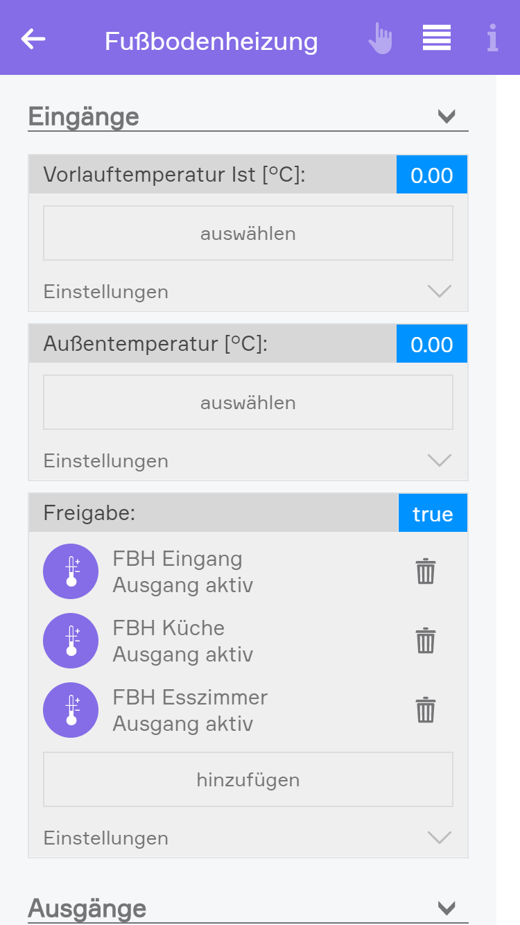 Hier wählen Sie die Hauptfreigabe (Anforderung) der Mischerregelung aus. Mit diesem Eingang können Sie die gesamte Regelung aktivieren und deaktivieren. Als Freigabe bieten sich die Anforderungssignale der Klimaregelung an. Mehrere verknüpfte Signale werden als ODER-Verknüpfung interpretiert.