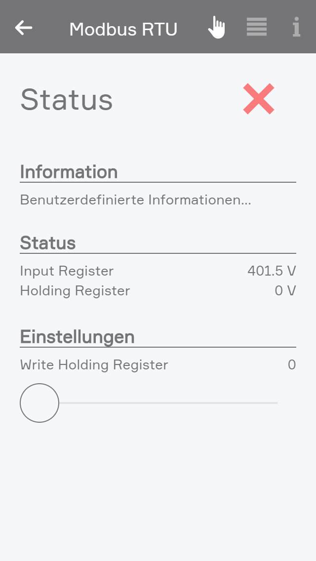 Als nächstes werden die Statuswerte aller lesbaren Register angezeigt und Bedienelemente für alle schreibenden Register angeboten. Nach der Konfiguration kann das Gerät hier gesteuert und ausgelesene Werte kontrolliert werden.