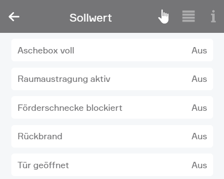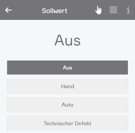 Sind bei einem Holding Register mit eingestelltem Format "Wert als Optionen" nicht mehr als 4 Optionen konfiguriert, so werden diese als Buttons im Operator Panel angezeigt. Bei mehr als 4 Optionen kann der Wert mittels einer Auswahlliste geändert werden.