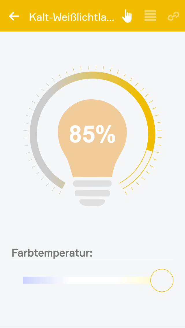 Bei kalt-warmweißen, dimmbaren Philips Hue Lichtern ist das OperatorPanel gleich wie das der dimmbaren Lichter aufgebaut, jedoch ist unterhalb noch ein Slider zum Einstellen der Farbtemperatur vorhanden.