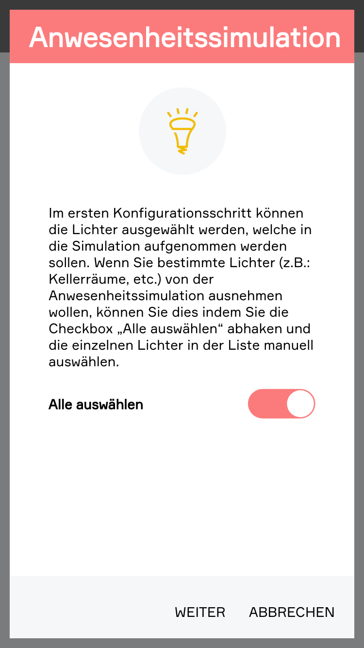 Im ersten Konfigurationsschritt können die Lichter ausgewählt werden, welche in die Simulation aufgenommen werden sollen. Wenn Sie bestimmte Lichter (z.B.: Kellerräume, etc.) von der Anwesenheitssimulation ausnehmen wollen, können Sie dies indem Sie die Checkbox „Alle auswählen“ abhaken und die einzelnen Lichter in der Liste manuell auswählen.