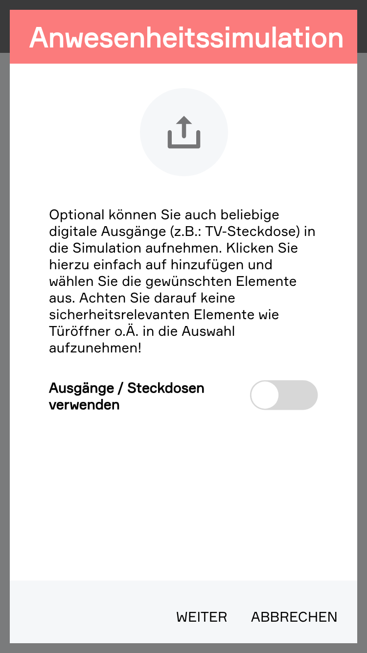Optional können Sie auch beliebige digitale Ausgänge (z.B.: TV-Steckdose) in die Simulation aufnehmen. Klicken Sie hierzu einfach auf hinzufügen und wählen Sie die gewünschten Elemente aus.