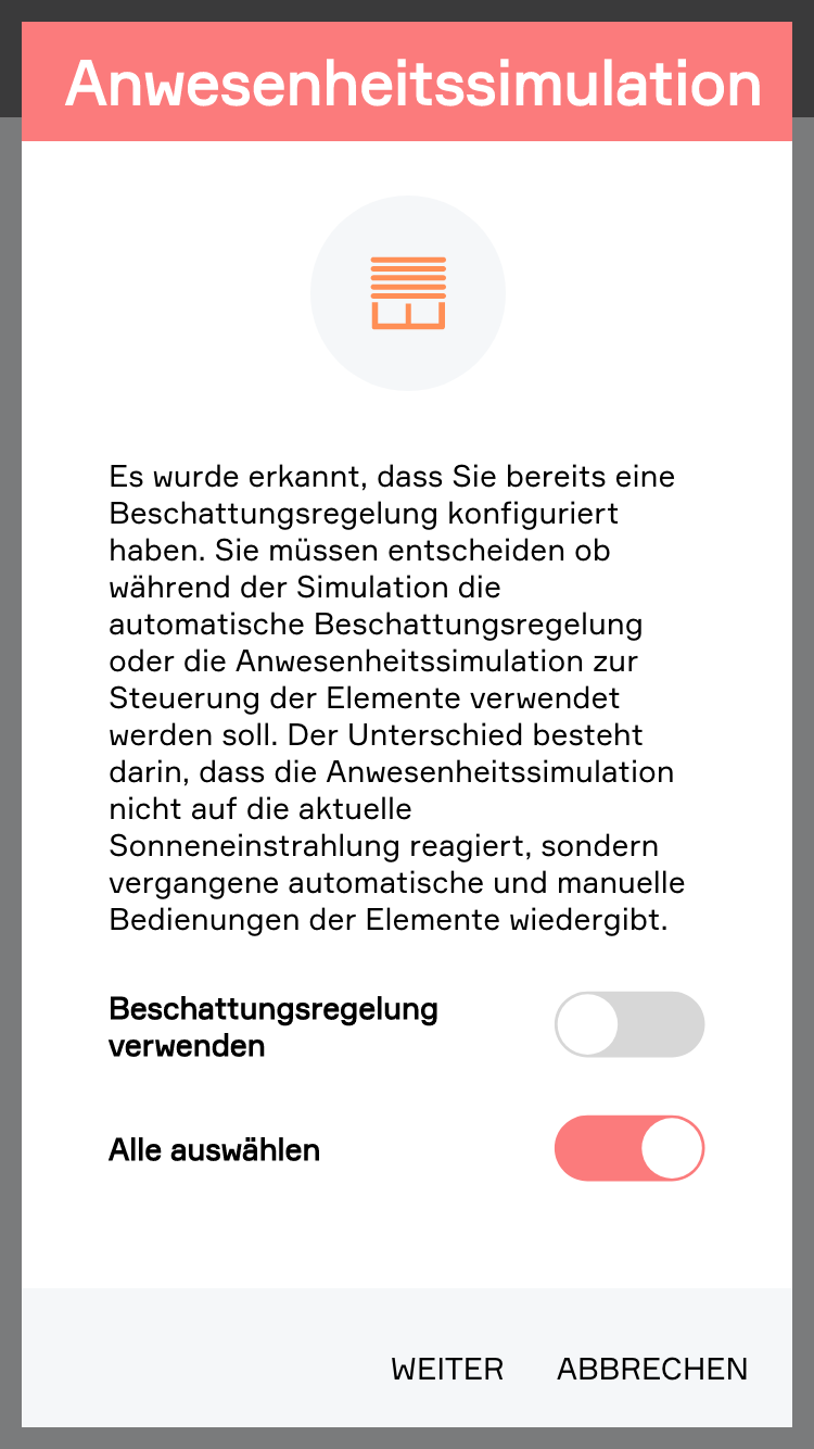 Wie auch bei den Lichtelementen können Sie entscheiden, ob Sie alle Elemente oder nur bestimmte für die Anwesenheitssimulation verwenden möchten.