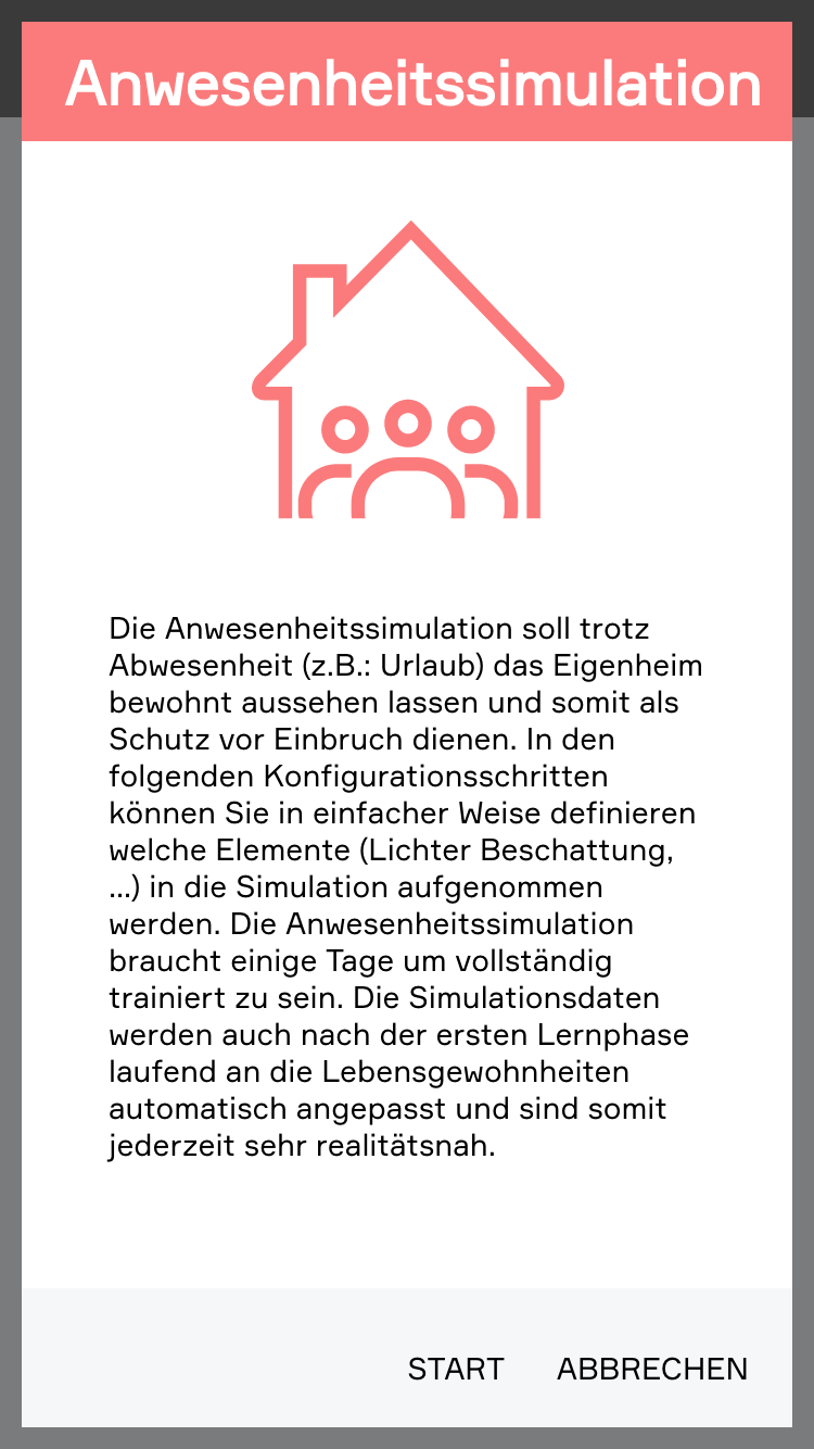 Die Anwesenheitssimulation existiert bereits und muss daher nicht mehr erstellt werden. Die Konfiguration können Sie mit wenigen Klicks ganz einfach vornehmen.