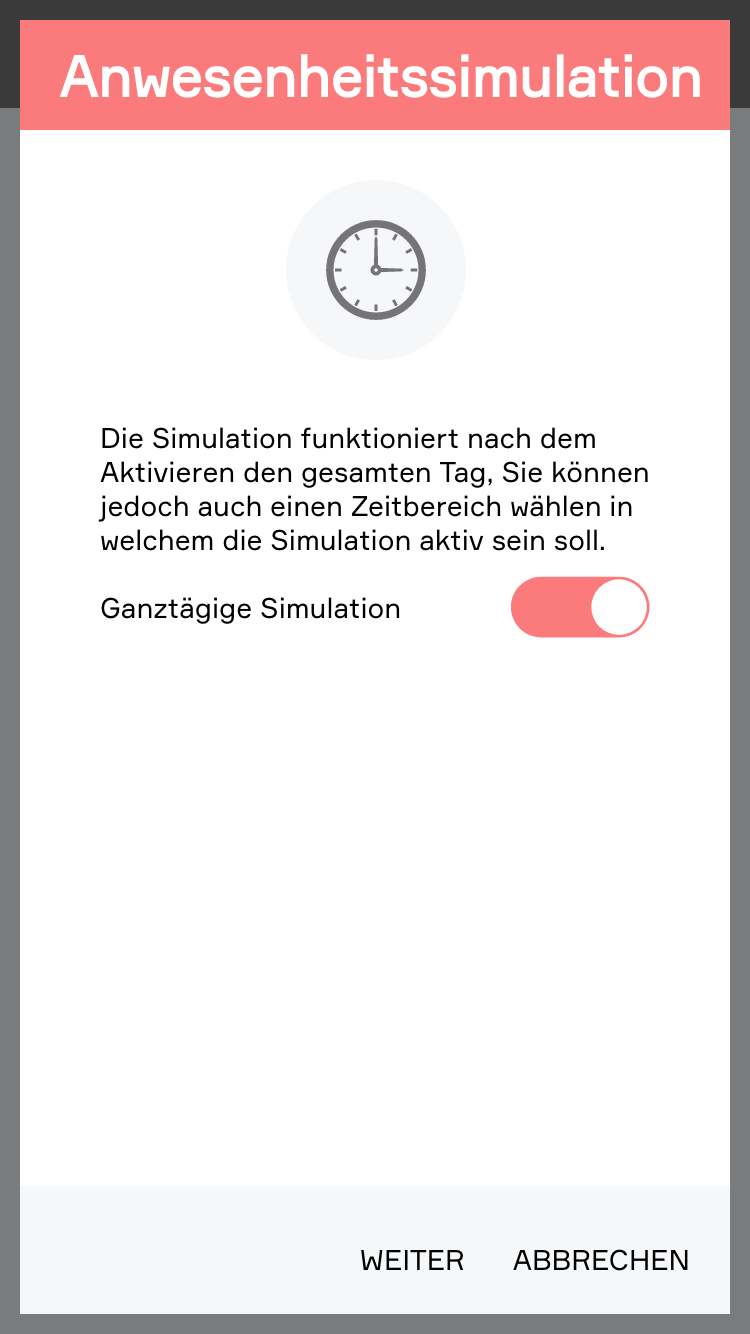 Die Simulation funktioniert nach dem Aktivieren den gesamten Tag, Sie können jedoch auch einen Zeitbereich wählen in welchem die Simulation aktiv sein soll.