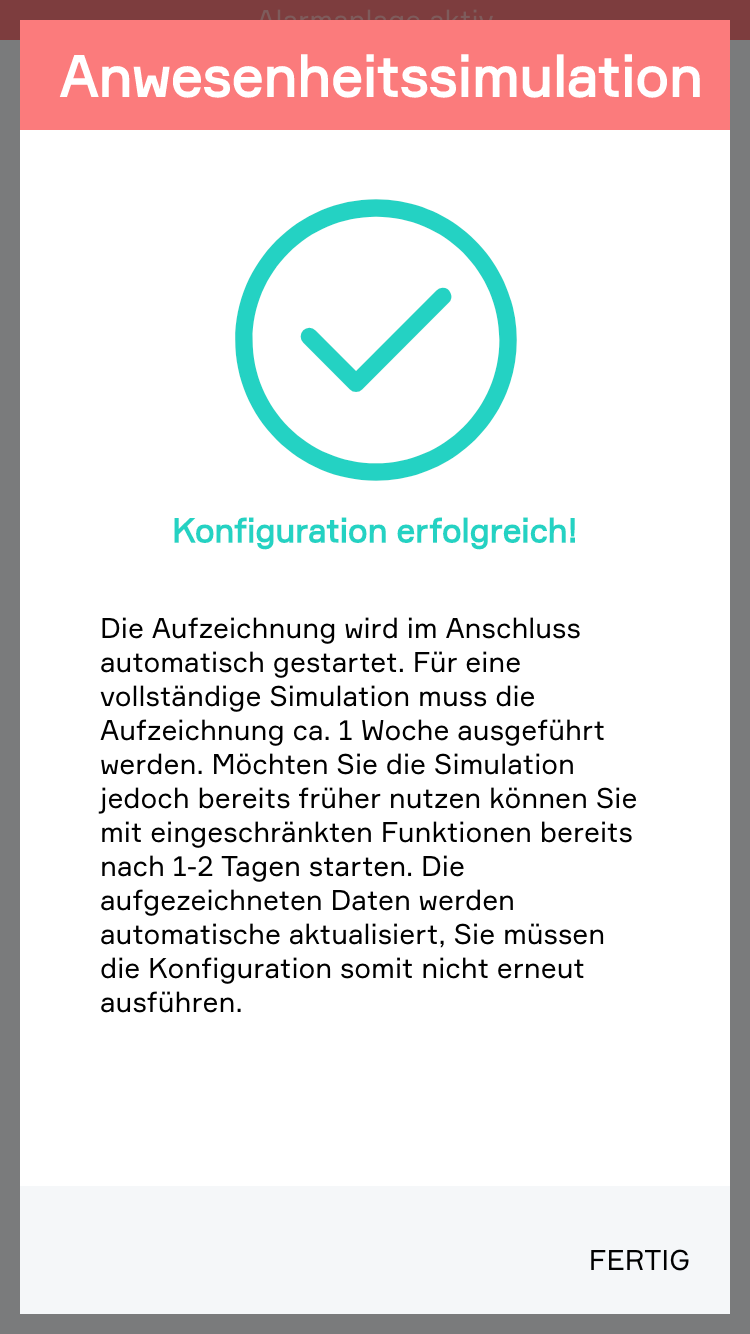 Die Konfiguration ist erfolgreich abgeschlossen! Die Aufzeichnung wird im Anschluss automatisch gestartet. Für eine vollständige Simulation muss die Aufzeichnung ca. 1 Woche ausgeführt werden. Möchten Sie die Simulation jedoch bereits früher nutzen können Sie mit eingeschränkten Funktionen bereits nach 1-2 Tagen starten.