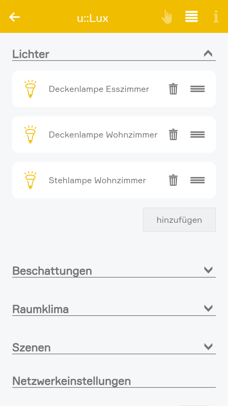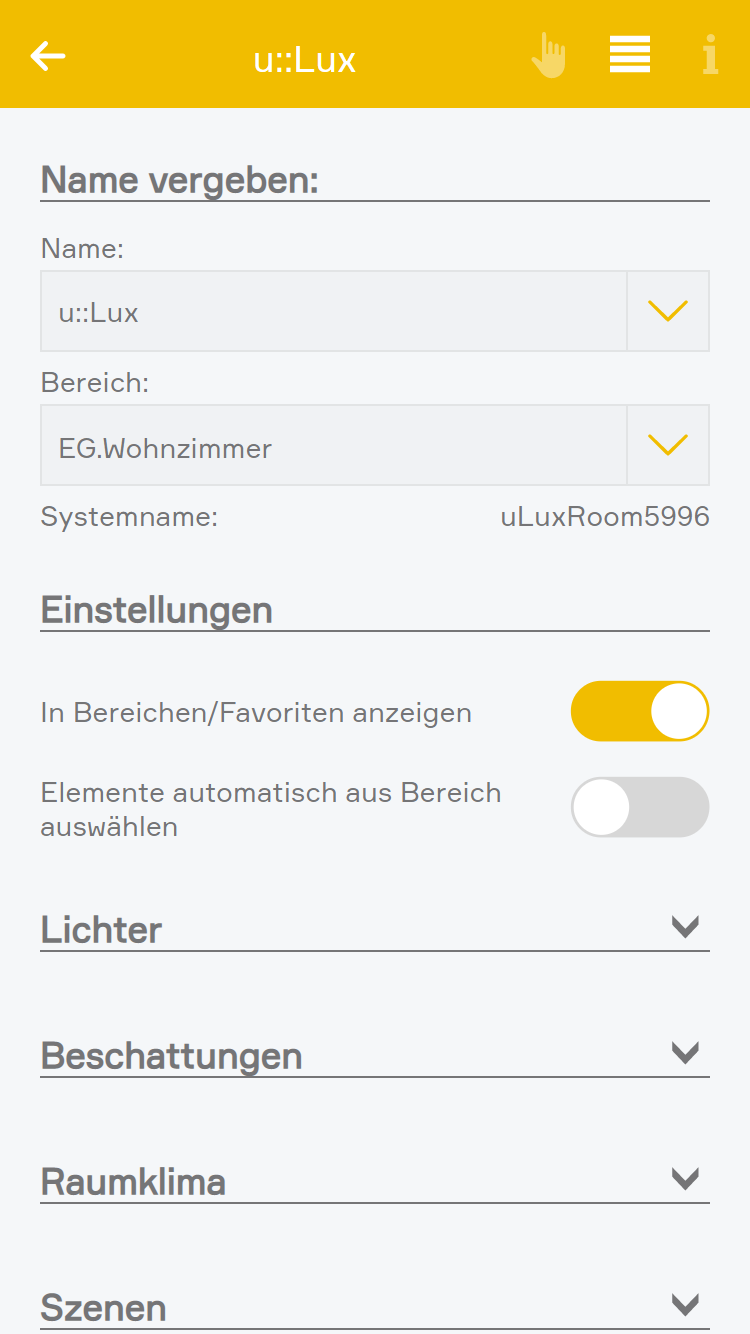 Der u::Lux Schalter wird automatisch im Bereich am Start Bildschirm angezeigt, mit der Einstellung "In Bereichen anzeigen" kann der Schalter in den Bereichen angezeigt und ausgeblendet werden.