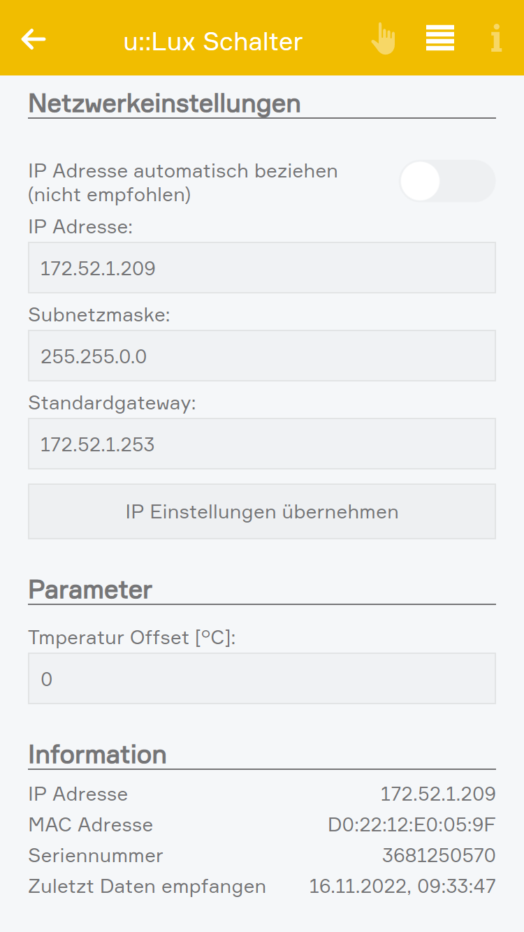 Nachdem Sie alle Einstellungen vorgenommen haben, können Sie mit dem Button 'IP Einstellungen übernehmen' die Einstellungen auf den u::Lux Schalter übertragen. Der Schalter startet dabei neu und ist nach einigen Sekunden vollständig konfiguriert.
