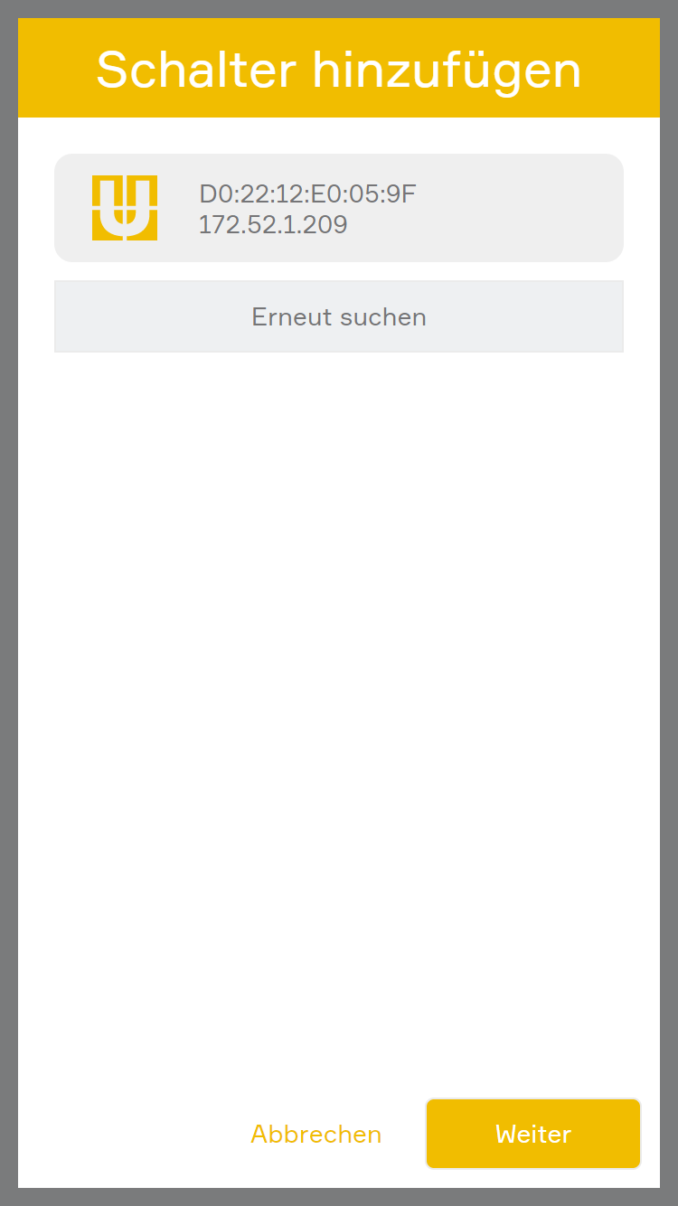 Zum Erstellen eines neuen u::Lux Schalters, klicken Sie auf das hinzufügen Symbol, danach wird automatisch die Suche nach u::Lux Schaltern in Ihrem Netzwerk gestartet. Sollte der Schalter nicht sofort erkannt werden, wiederholen Sie die Suche ganz einfach. Nachdem der Schalter gefunden wurde, können Sie den entsprechenden Schalter selektieren und mit "Weiter" konfigurieren.