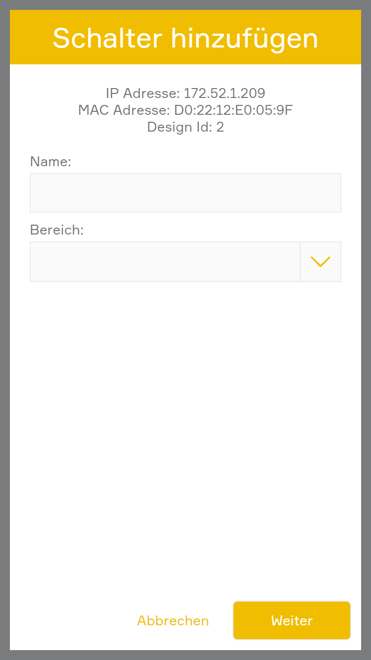 Nachdem der u::Lux Schalter gefunden wurde, können Sie den Namen und Raum für den Schalter vergeben.