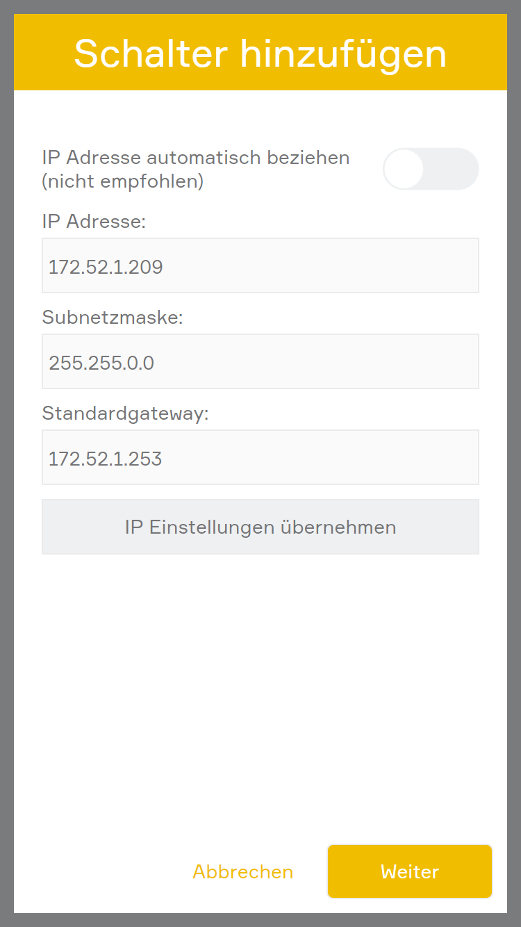 Bei Schaltern mit der Design Vorlage Version 2, können zusätzlich noch die IP-Einstellungen vergeben werden. Hier empfiehlt es sich eine statische IP-Adresse zu vergeben. Mit "IP Einstellungen übernehmen" werden diese Einstellungen am u::Lux Schalter gesetzt.