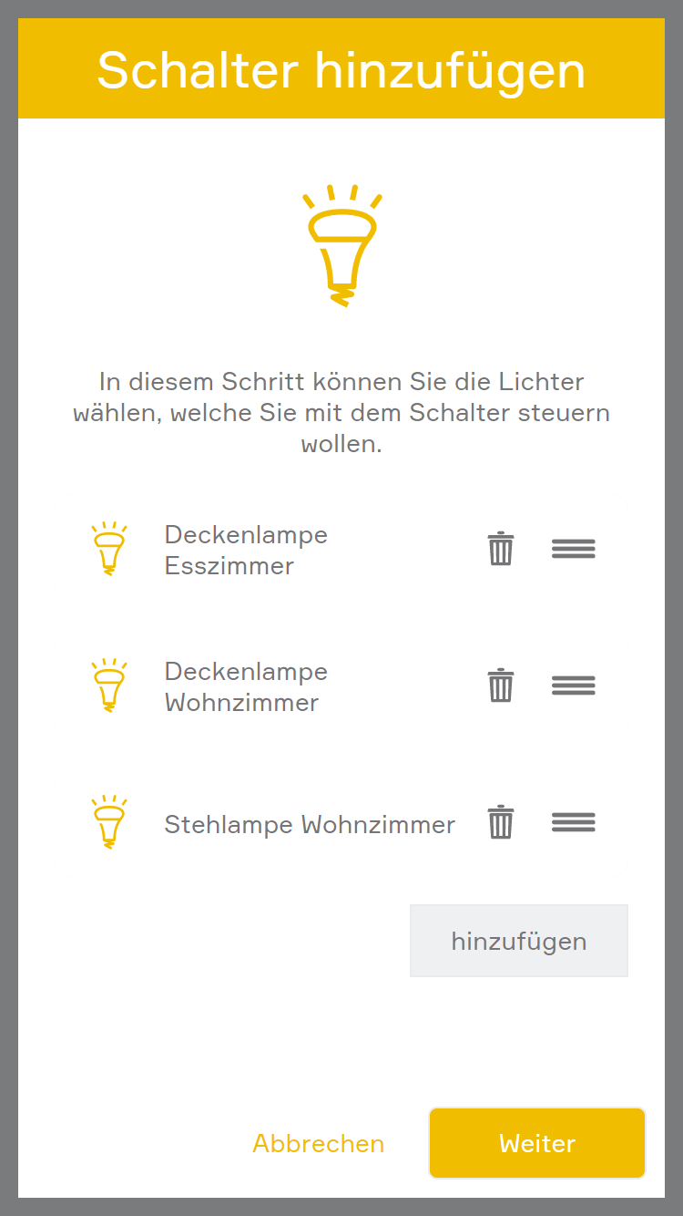 Wenn Sie eine manuelle Konfiguration gewählt haben, können Sie in den folgenden Schritten die einzelnen Elemente (Licht, Beschattung, Raumklima und Szenen) wählen, welche Sie über den Schalter steuern wollen. Zusätzlich können Sie hier die Reihenfolge wie die Elemente am Schalter angezeigt werden anpassen.