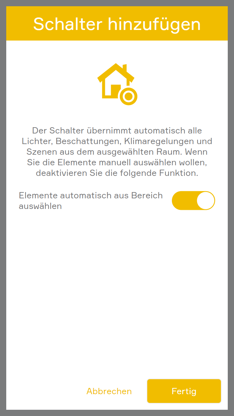 Nun können Sie auswählen, ob der Schalter automatisch alle Elemente (Licht, Beschattung, Raumklima und Szenen) aus dem verknüpften Bereich übernehmen soll, oder die Elemente manuell vergeben werden sollen.