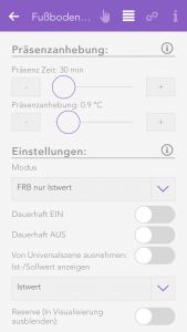Hält man den Finger oder Klick länger auf dem ObjectPanel der Wärmepumpe gedrückt, kann im erscheinenden Menü die Größe des Panels umgestellt werden. In der großen Version ist zusätzlich das Bedienelement für die Steuerung der Betriebsstufe sichtbar.