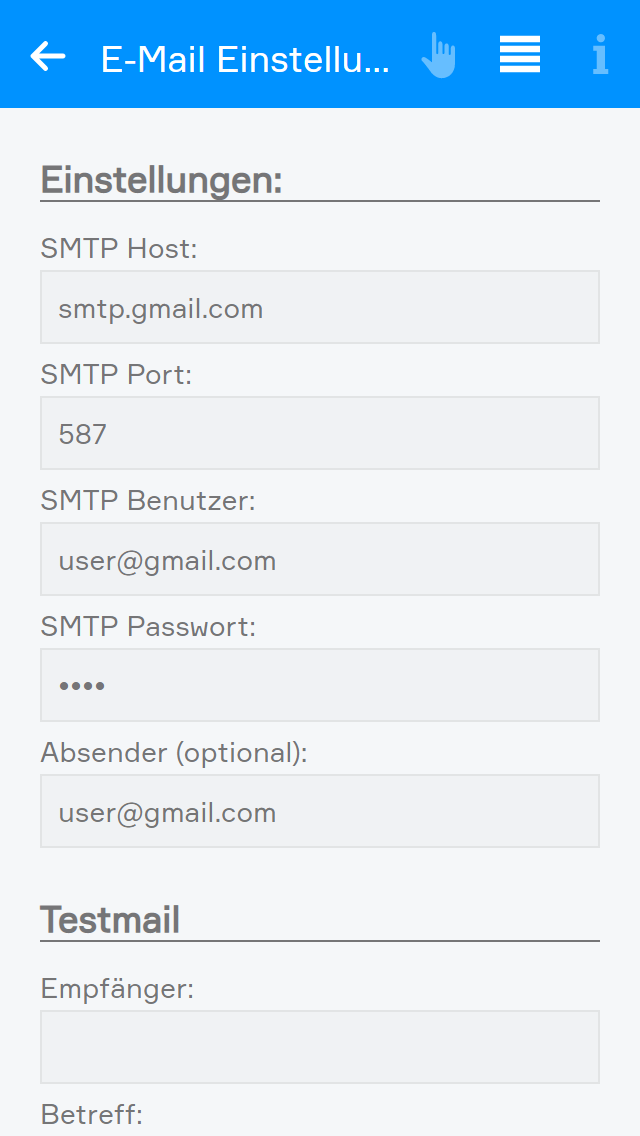 In den Einstellungen kann der SMTP Server und die Zugangsdaten eingestellt werden. Die erforderlichen Einstellungen (SMTP-Server) können Sie von Ihrem E-Mail-Anbieter beziehen.