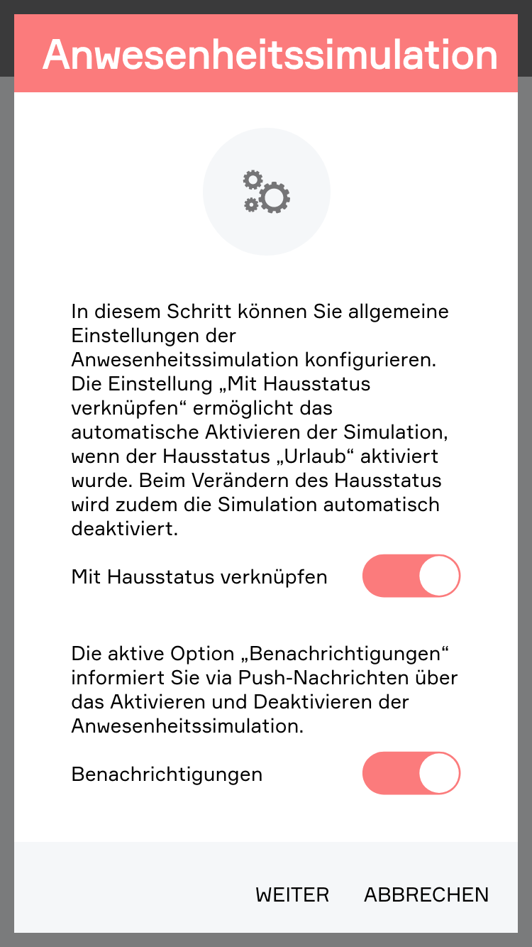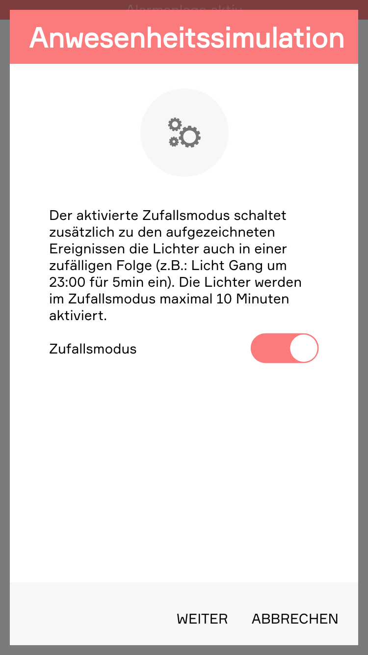 Die Anwesenheitssimulation existiert bereits und muss daher nicht mehr erstellt werden. Die Konfiguration können Sie mit wenigen Klicks ganz einfach vornehmen.