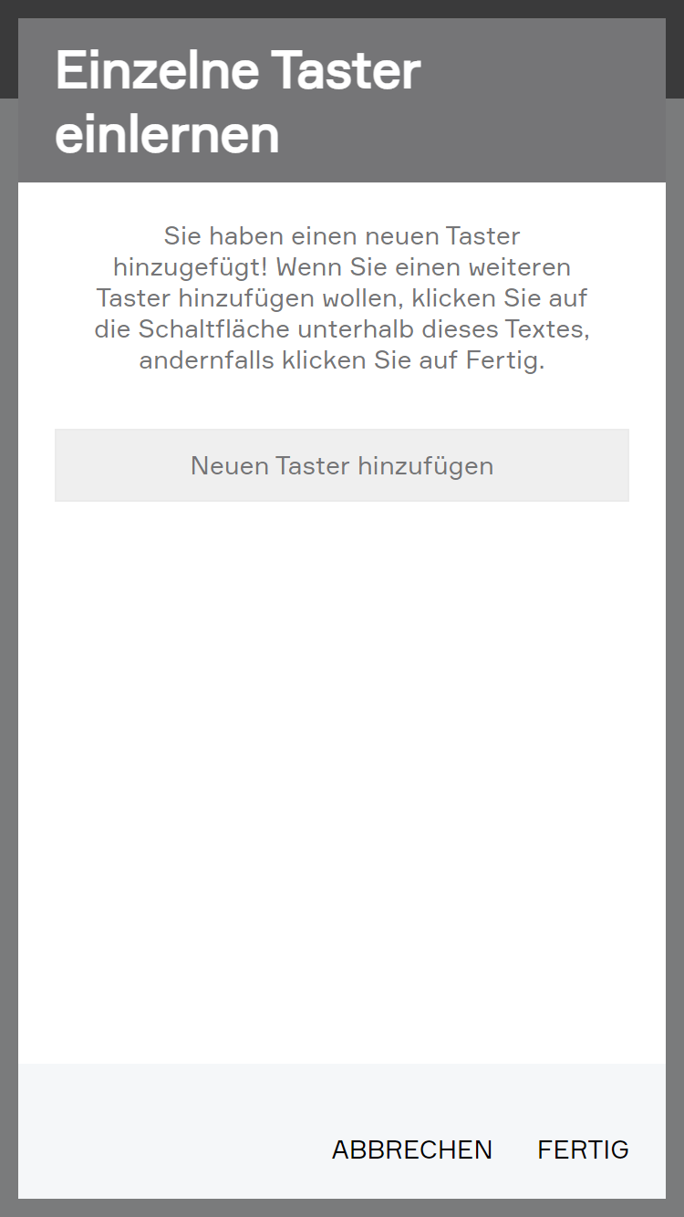 Nun können Sie die eingelernten Taster mit einem Klick auf "Fertig" in Ihr evon Smart Home hinzufügen, oder mittels eines Klicks auf “Neuen Taster hinzufügen”, weitere Taster konfigurieren.