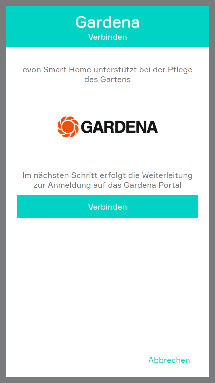 Nach dem Öffnen des Wizards, erfolgt durch einen Klick auf Verbinden die Weiterleitung zur Anmeldung auf das Gardena Portal.