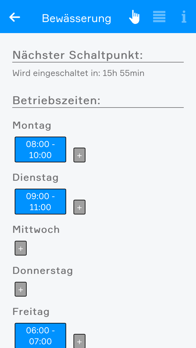 Nun wählen Sie über das „+“ den Tag aus, an dem die Bewässerung aktiviert werden soll. Im Fenster, das sich danach öffnet, stellen Sie die zwei Zeiten „Von“ und „Bis“ ein. D.h. die Bewässerung soll innerhalb dieses Zeitraumes aktiv sein (z.B. von Montag von 8:00 bis 10:00). Danach sehen Sie ganz oben im Operatorpanel, wie lange es bis zum nächsten Schaltpunkt noch dauert.