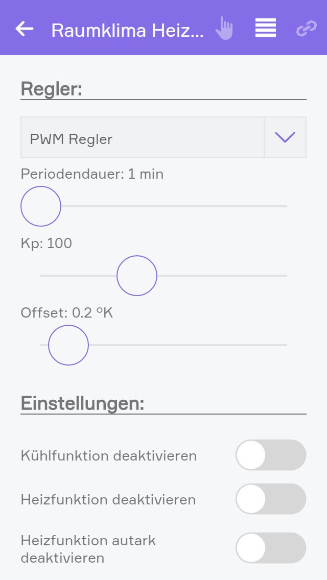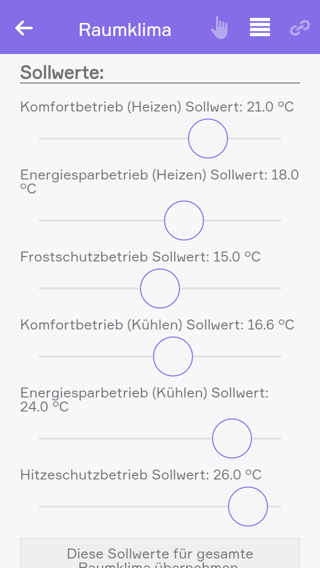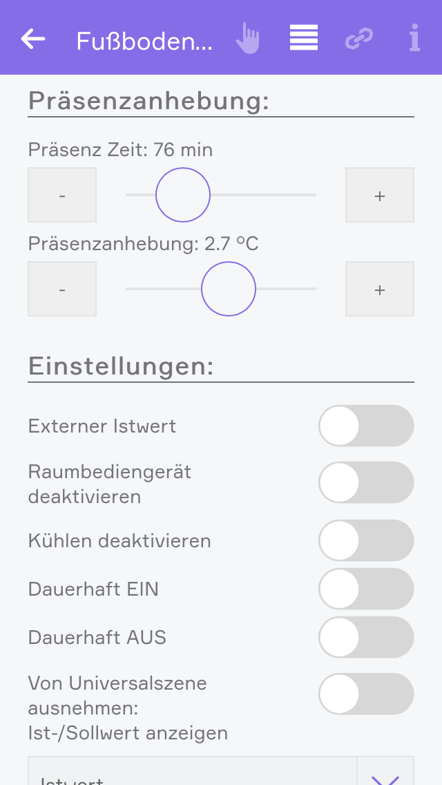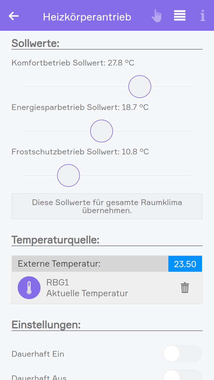 Mit dieser Einstellung können Sie Ihr angeschlossenes Raumbediengerät deaktivieren. Dadurch wird nur noch der Istwert übernommen und alle anderen Werte des Raumbediengeräts ignoriert.