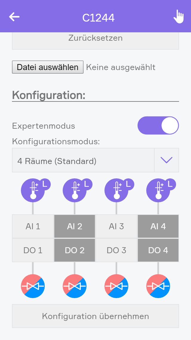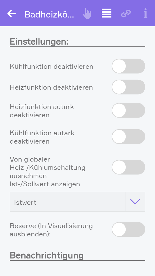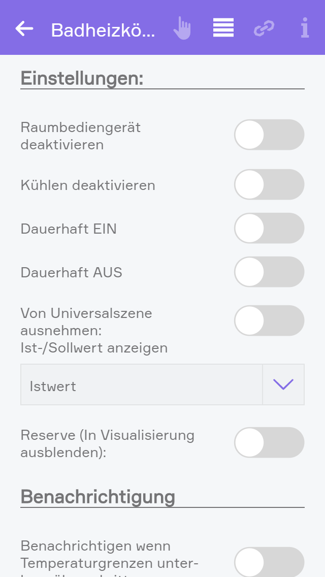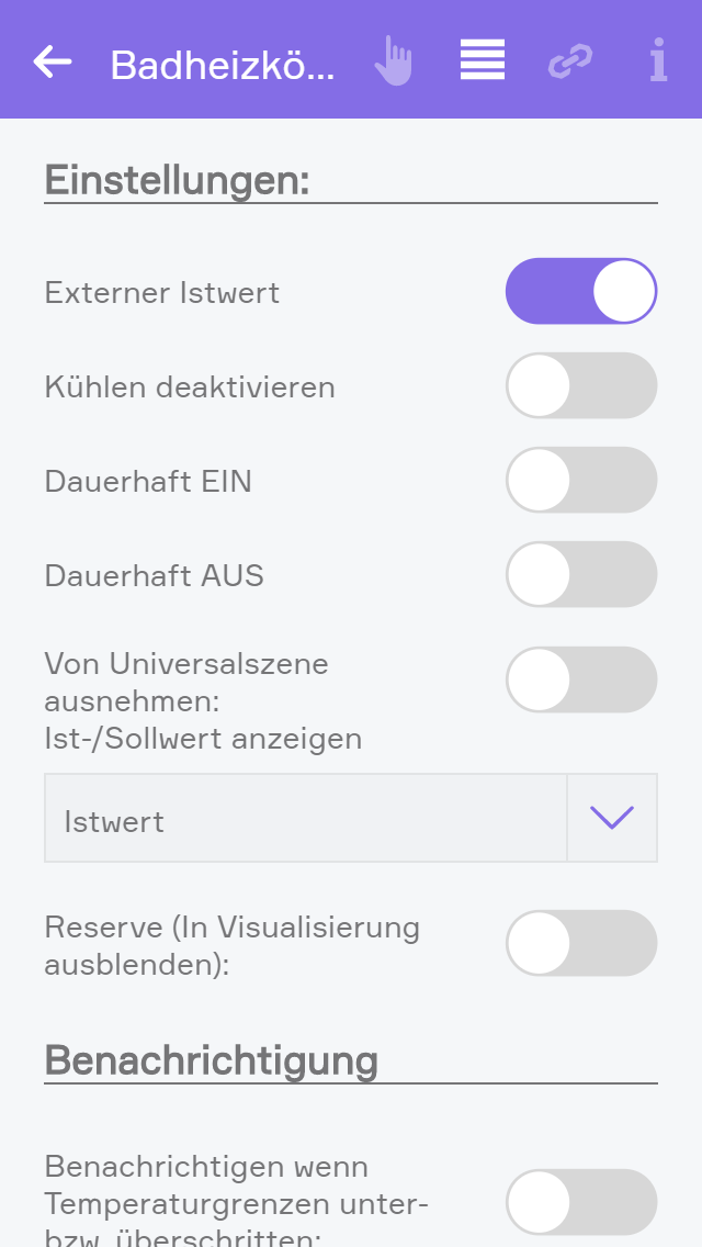 Wenn an einem Modul nicht alle Raumklimakanäle angeschlossen sind, werden für dieses Modul trotzdem alle vier Steuerelemente angezeigt. Um diese unbelegten Steuerelemente auszublenden, können Sie sie als Reserve markieren. Über die App “Hardware” (“Alle Apps” – “Hardware”) können Sie ausgeblendete Elemente wieder einblenden.