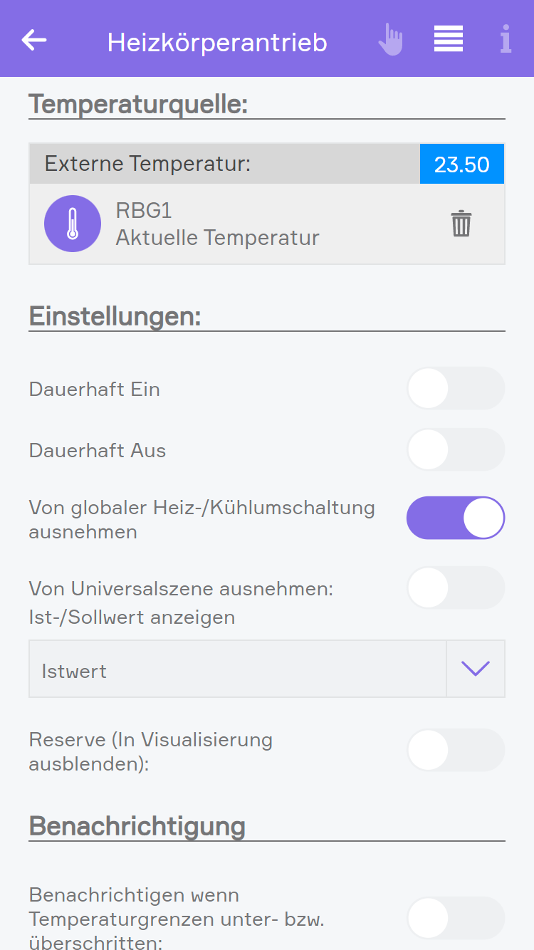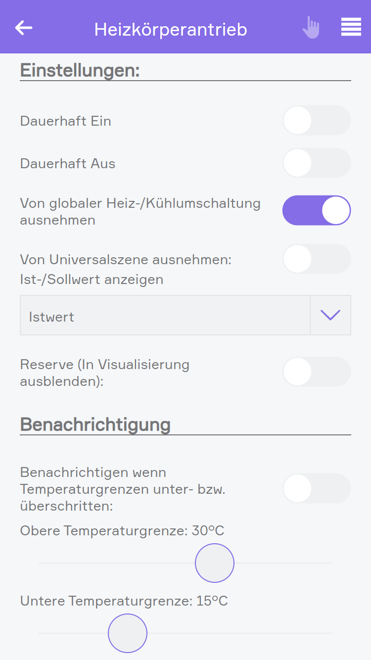 Unabhängig von der aktuellen Temperatur und der aktuellen Betriebsart kann der Ventilausgang hiermit dauerhaft ein- bzw. ausgeschaltet werden.