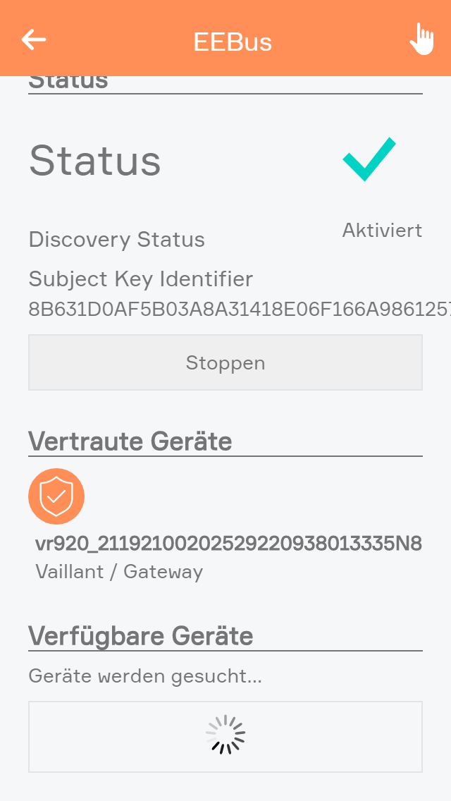 Um Geräte wie Vaillant einzubinden muss das Protokoll EEBus aktiviert werden. Das kann in den Einstellungen unter "EEBus" mit dem Button "Starten" aktiviert werden.